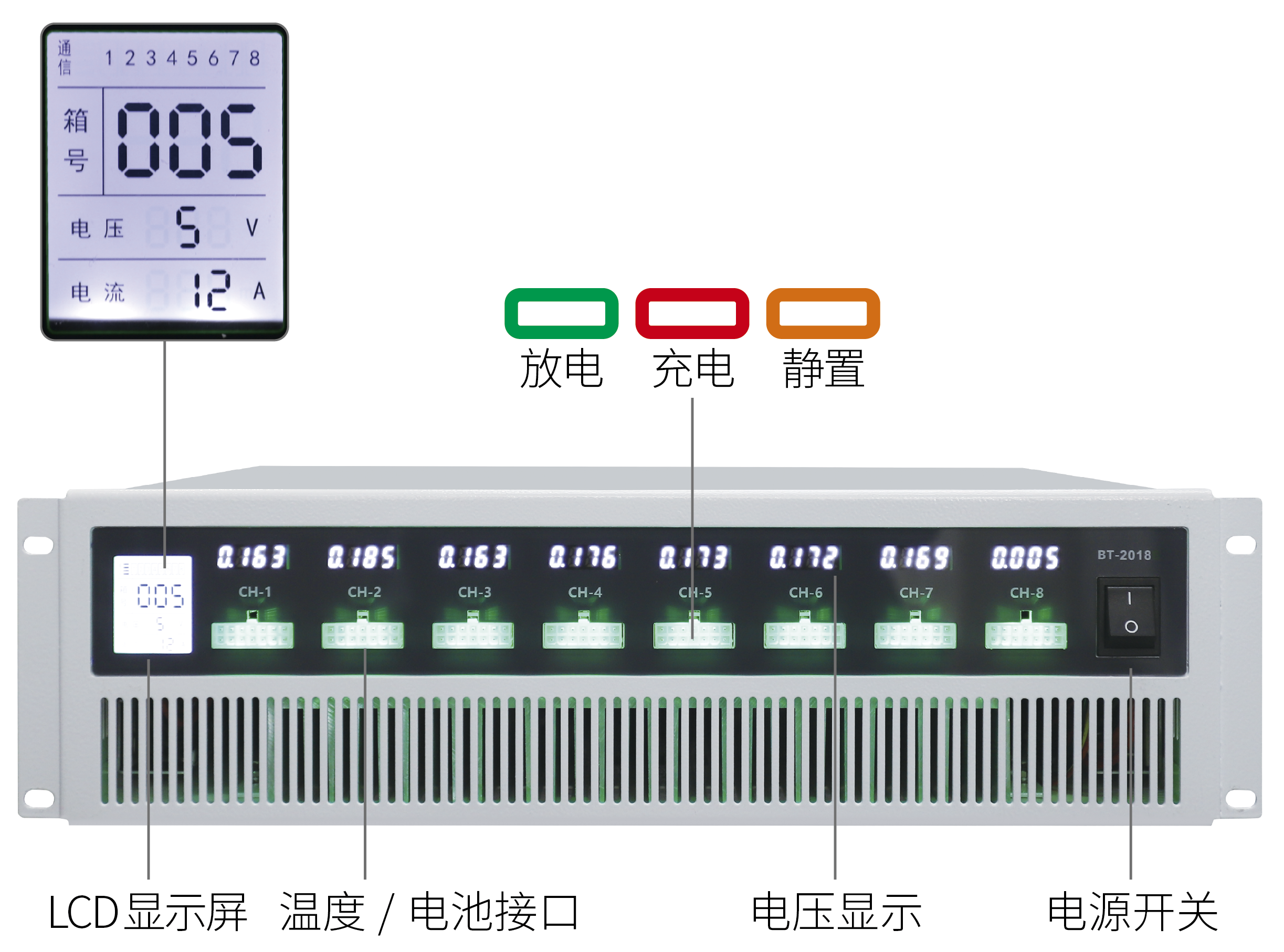 屏显信息 | 3寸LCD(箱号、电压量程、电流量程、通信状态、通道号等)亮度可调节 | |