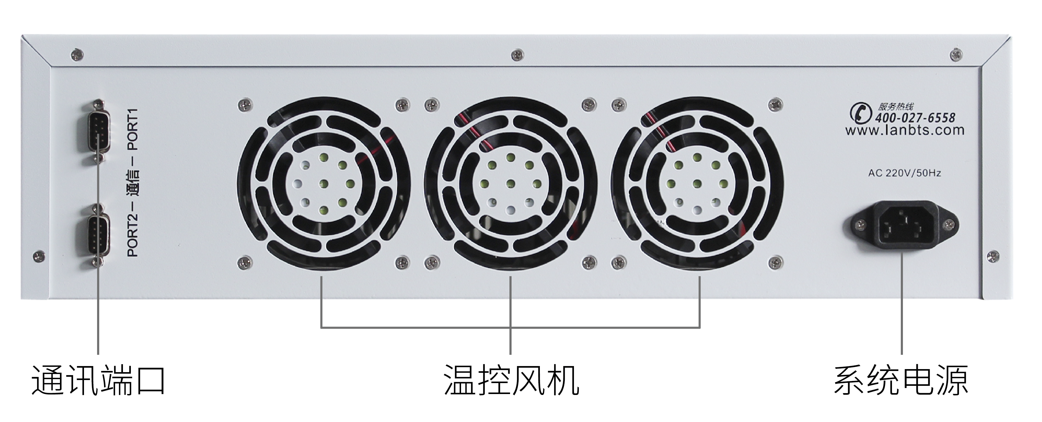 3、电池输入接口电缆线从设备前面插入,后面出线的方式,方便与高低温箱或高温房配合使用;